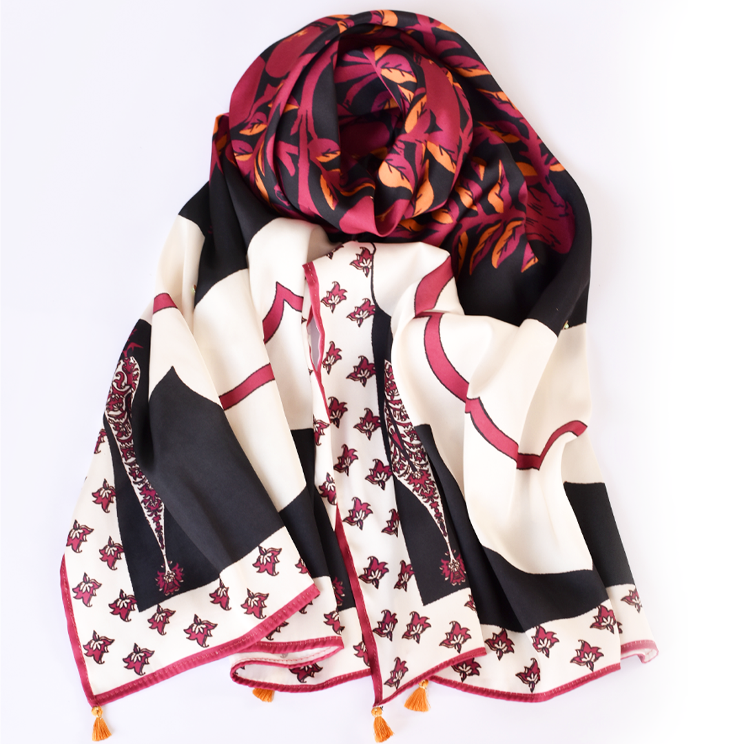 This silk scarf features digital print inspired by Mughal era with clean edge finish and handmade tassels, perfect for both warm and cool weather and fluid drapeability for an effortless wear.